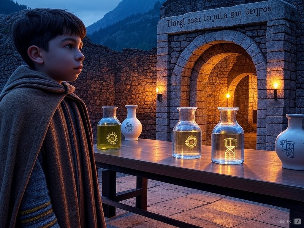 Alper bir süre düşündü, ama yanıtını bulamadan içeri girdi. Onu içeride devasa bir salona götürdüler. Salonun ortasında bir masa, masanın üzerinde de tam üç farklı büyüklükte kâse vardı: biri küçük, biri orta, bir diğeri ise oldukça büyüktü. Kâselerin her biri boştu ancak üzerlerinde farklı semboller kazılıydı. Küçük kâsede bir güneş, orta kâsede bir ay ve büyük kâsede bir kum saati simgesi kazınmıştı.